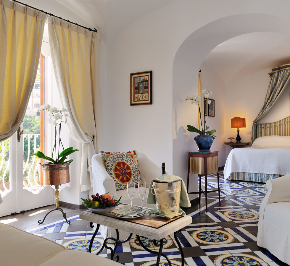 Almost all rooms, suites and junior suites look out over the bay of Positano. Most have a private terrace or balcony and all have white-washed walls, vaulted ceilings and hand-made tiles on the floors.